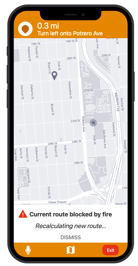 - Challenge: How would you let the user know there’s a fire happening in a nearby town that is causing road closures? The effect on their commute is unknown, but there is a definite danger if the fire gets closer. How do you communicate this to them? When? Write it.